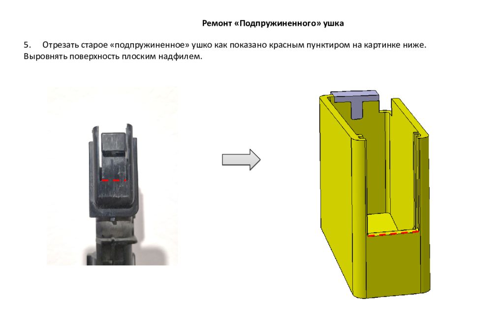 5. Отрезать старое «подпружиненное» ушко как показано красным пунктиром на картинке ниже. Выровнять поверхность плоским надфилем. Ремонт «Подпружиненного» ушка