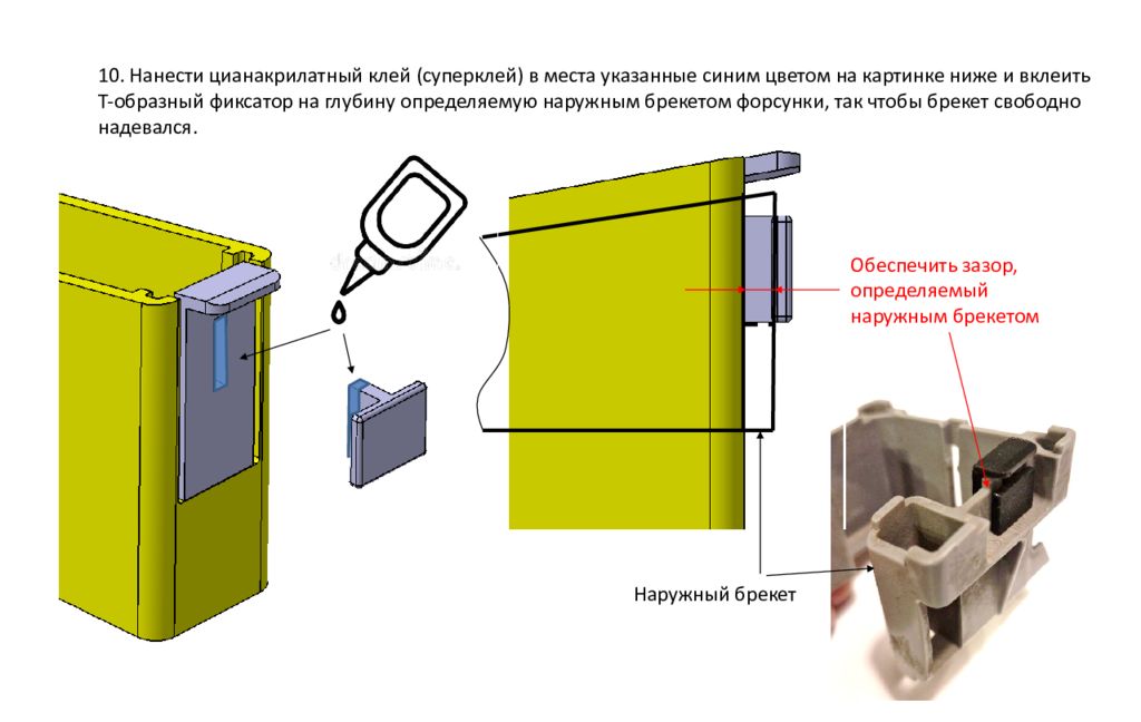 10. Нанести цианакрилатный клей (суперклей) в места указанные синим цветом на картинке ниже и в клеить Т-образный фиксатор на глубину определяемую наружным брекетом форсунки, так чтобы брекет свободно надевался. Наружный брекет Обеспечить зазор, определяемый наружным брекетом
