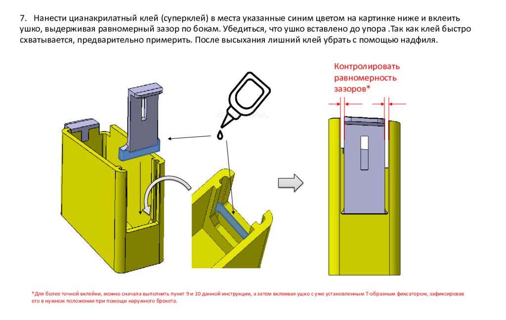 7. Нанести цианакрилатный клей (суперклей) в места указанные синим цветом на картинке ниже и вклеить ушко, выдерживая равномерный зазор по бокам. Убедиться, что ушко вставлено до упора.Так как клей быстро схватывается, предварительно примерить. После высыхания лишний клей убрать с помощью надфиля. *Для более точной вклейки, можно сначала выполнить пункт 9 и 10 данной инструкции, а затем вклеивая ушко с уже установленным Т-образным фиксатором, зафиксировав его в нужном положении при помощи наружного брекета. Контролировать равномерность зазоров*