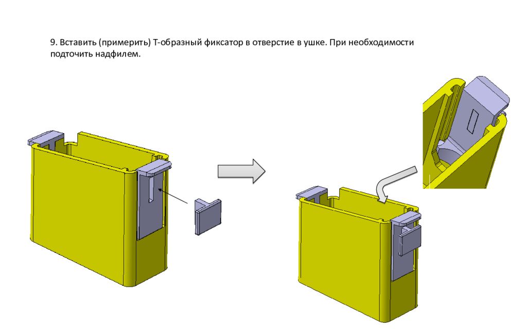 9. Вставить ( примерить) Т-образный фиксатор в отверстие в ушке. При необходимости подточить надфилем.