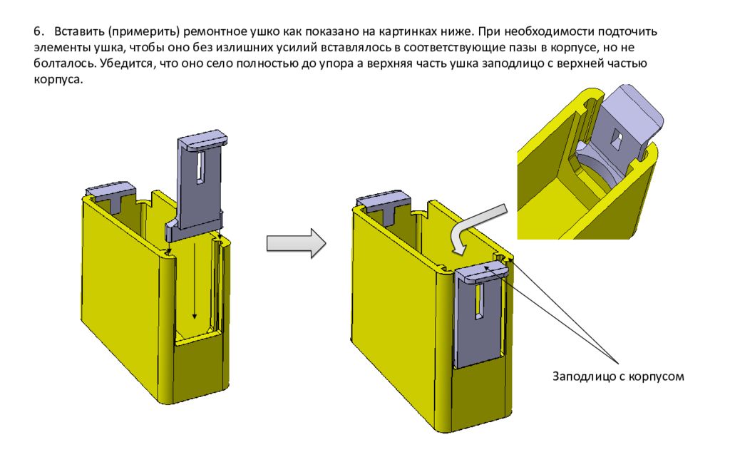 6. Вставить ( примерить) ремонтное ушко как показано на картинках ниже. При необходимости подточить элементы ушка, чтобы оно без излишних усилий вставлялось в соответствующи е пазы в корпусе, но не болталось. Убедится, что оно село полностью до упора а верхняя часть ушка заподлицо с верхней частью корпуса. Заподлицо с корпусом