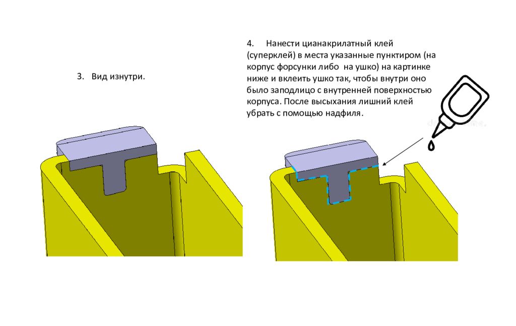 В ид изнутри. 4. Нанести цианакрилатный клей (суперклей) в места указанные пунктиром ( на корпус форсунки либо на ушко) на картинке ниже и вклеить ушко так, чтобы внутри оно было заподлицо с внутренней поверхностью корпуса. После высыхания лишний клей убрать с помощью надфиля.