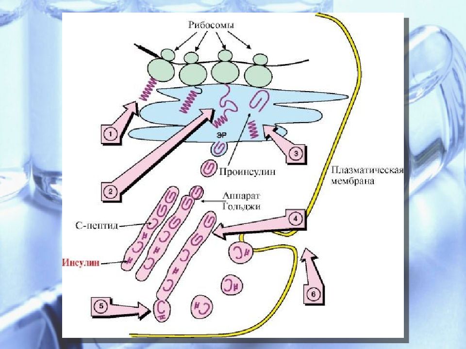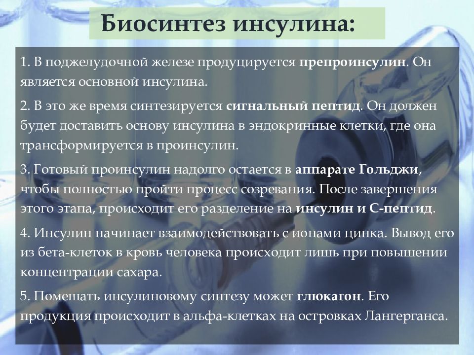 1. В поджелудочной железе продуцируется препроинсулин. Он является основной инсулина. 2. В это же время синтезируется сигнальный пептид. Он должен будет доставить основу инсулина в эндокринные клетки, где она трансформируется в проинсулин. 3. Готовый проинсулин надолго остается в аппарате Гольджи, чтобы полностью пройти процесс созревания. После завершения этого этапа, происходит его разделение на инсулин и С-пептид. 4. Инсулин начинает взаимодействовать с ионами цинка. Вывод его из бета-клеток в кровь человека происходит лишь при повышении концентрации сахара. 5. Помешать инсулиновому синтезу может глюкагон. Его продукция происходит в альфа-клетках на островках Лангерганса.