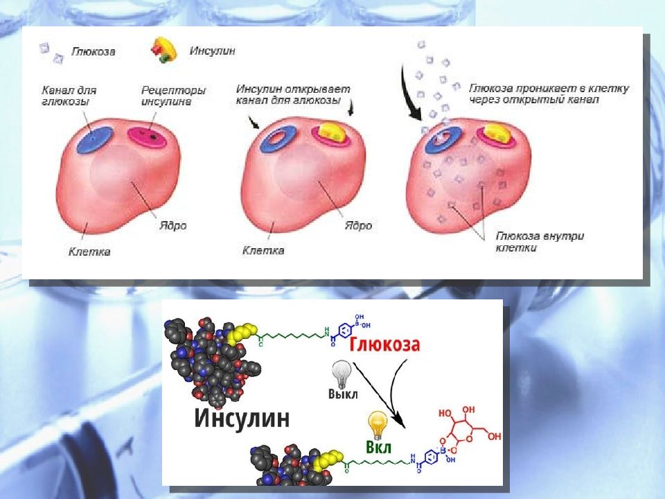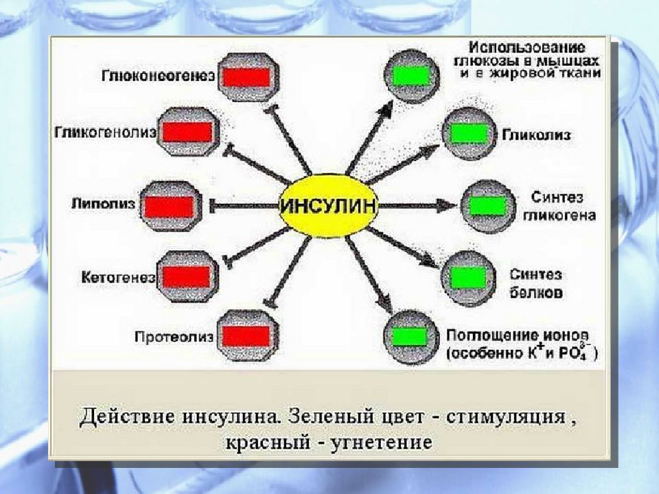 Обеспечивает транспорт глюкозы внутри клеток (усвоение и утилизацию ); Отвечает за образование гликогена (резервной глюкозы) и его накопление в клетках печени и других органов; Стимулирует синтез белков и жиров; Увеличивает проницаемость клеточных стенок для аминокислот.