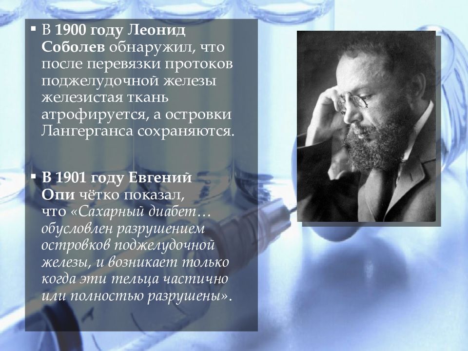 В 1900 году Леонид Соболев обнаружил, что после перевязки протоков поджелудочной железы железистая ткань атрофируется, а островки Лангерганса сохраняются. В 1901 году Евгений Опи чётко показал, что «Сахарный диабет… обусловлен разрушением островков поджелудочной железы, и возникает только когда эти тельца частично или полностью разрушены».