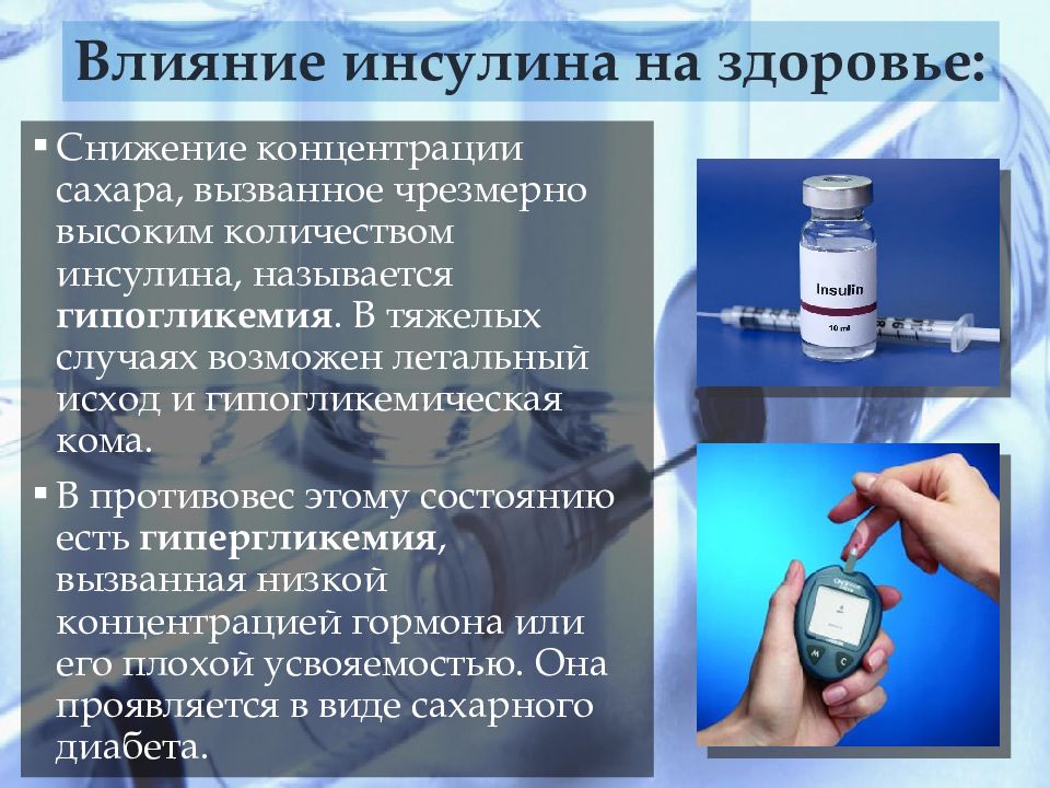 Снижение концентрации сахара, вызванное чрезмерно высоким количеством инсулина, называется гипогликемия. В тяжелых случаях возможен летальный исход и гипогликемическая кома. В противовес этому состоянию есть гипергликемия, вызванная низкой концентрацией гормона или его плохой усвояемостью. Она проявляется в виде сахарного диабета.