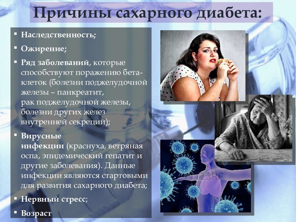 Наследственность; Ожирение ; Ряд заболеваний, которые способствуют поражению бета-клеток (болезни поджелудочной железы – панкреатит, рак поджелудочной железы, болезни других желез внутренней секреции); Вирусные инфекции (краснуха, ветряная оспа, эпидемический гепатит и другие заболевания). Данные инфекции являются стартовыми для развития сахарного диабета ; Нервный стресс ; Возраст
