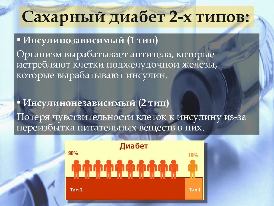 Инсулинозависимый (1 тип) О рганизм вырабатывает антитела, которые истребляют клетки поджелудочной железы, которые вырабатывают инсулин. Инсулинонезависимый (2 тип) Потеря чувствительности клеток к инсулину из-за переизбытка питательных веществ в них.