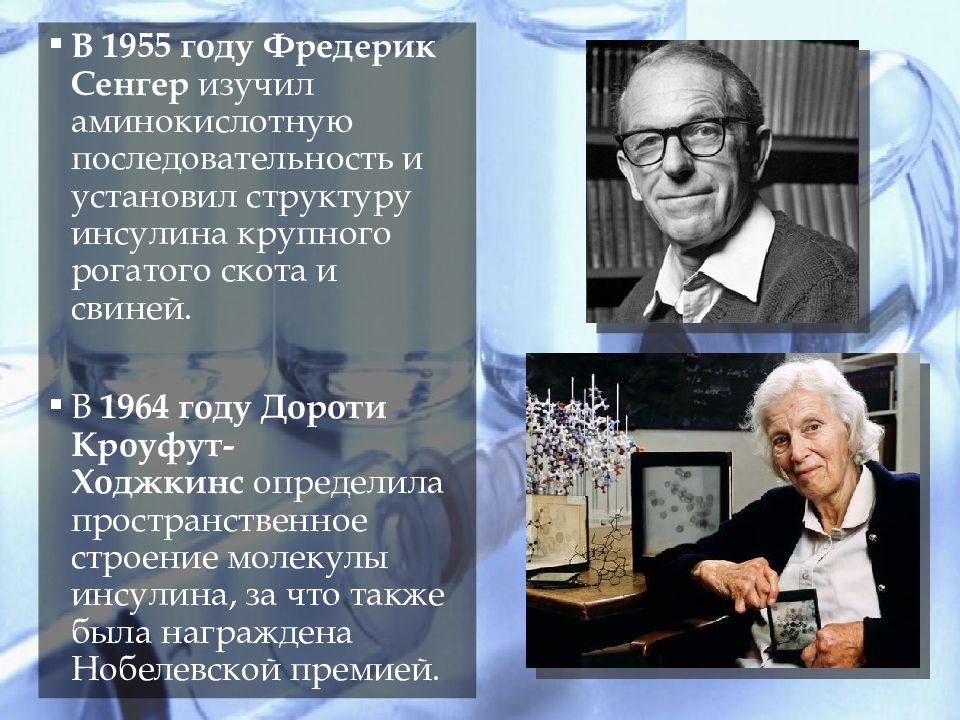 В 1955 году Фредерик Сенгер изучил аминокислотную последовательность и установил структуру инсулина крупного рогатого скота и свиней. В 1964 году Дороти Кроуфут- Ходжкинс определила пространственное строение молекулы инсулина, за что также была награждена Нобелевской премией.