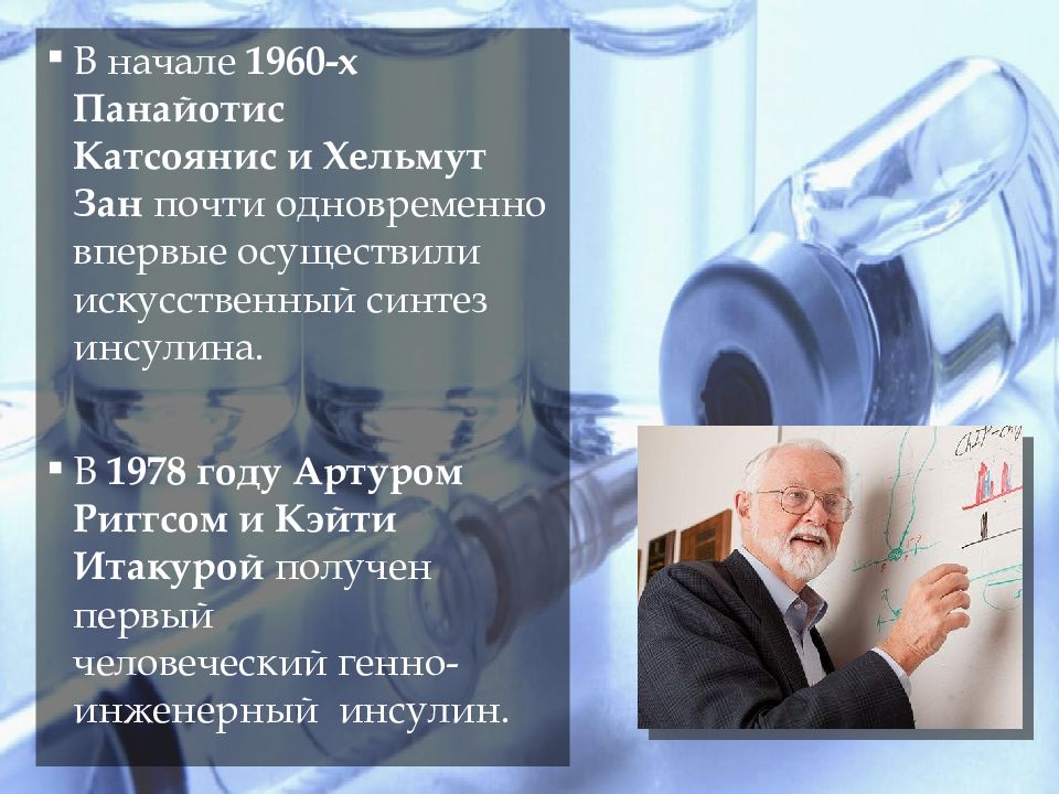 В начале 1960-х Панайотис Катсоянис и Хельмут Зан почти одновременно впервые осуществили искусственный синтез инсулина. В 1978 году Артуром Риггсом и Кэйти Итакурой получен первый человеческий генно-инженерный инсулин.