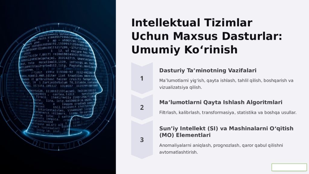 Intellektual Tizimlar Uchun Maxsus Dasturlar: Umumiy Ko‘rinish Dasturiy Ta’minotning Vazifalari Ma’lumotlarni yig‘ish, qayta ishlash, tahlil qilish, boshqarish va vizualizatsiya qilish. Ma’lumotlarni Qayta Ishlash Algoritmlari Filtrlash, kalibrlash, transformasiya, statistika va boshqa usullar. Sun’iy Intellekt (SI) va Mashinalarni O‘qitish (MO) Elementlari Anomaliyalarni aniqlash, prognozlash, qaror qabul qilishni avtomatlashtirish.