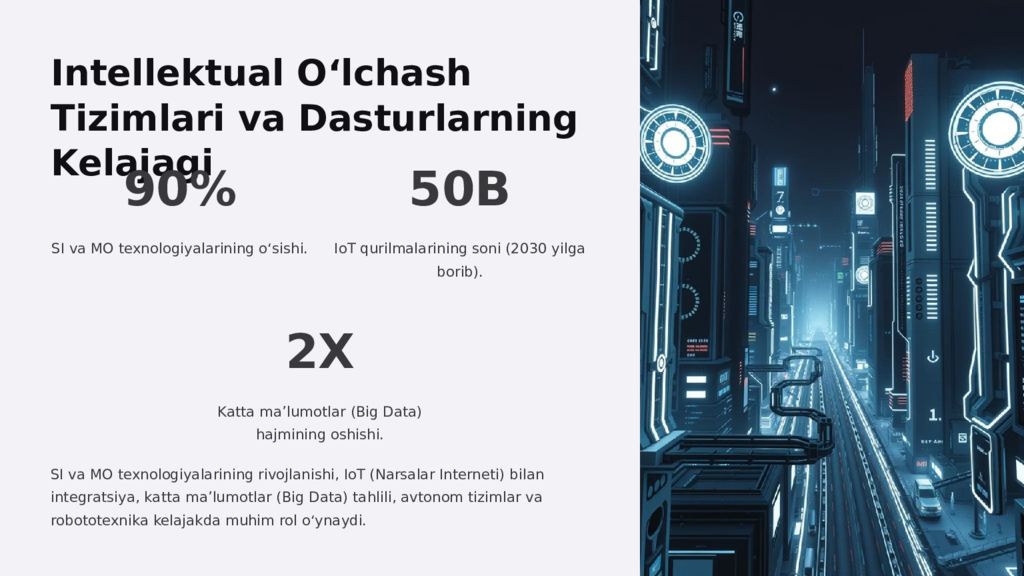 Intellektual O‘lchash Tizimlari va Dasturlarning Kelajagi 90% SI va MO texnologiyalarining o‘sishi. 50B IoT qurilmalarining soni (2030 yilga borib). 2X Katta ma’lumotlar (Big Data) hajmining oshishi. SI va MO texnologiyalarining rivojlanishi, IoT (Narsalar Interneti) bilan integratsiya, katta ma’lumotlar (Big Data) tahlili, avtonom tizimlar va robototexnika kelajakda muhim rol o‘ynaydi.