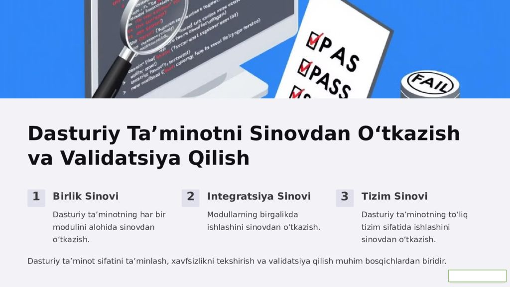 Dasturiy Ta’minotni Sinovdan O‘tkazish va Validatsiya Qilish 1 Birlik Sinovi Dasturiy ta’minotning har bir modulini alohida sinovdan o‘tkazish. 2 Integratsiya Sinovi Modullarning birgalikda ishlashini sinovdan o‘tkazish. 3 Tizim Sinovi Dasturiy ta’minotning to‘liq tizim sifatida ishlashini sinovdan o‘tkazish. Dasturiy ta’minot sifatini ta’minlash, xavfsizlikni tekshirish va validatsiya qilish muhim bosqichlardan biridir.