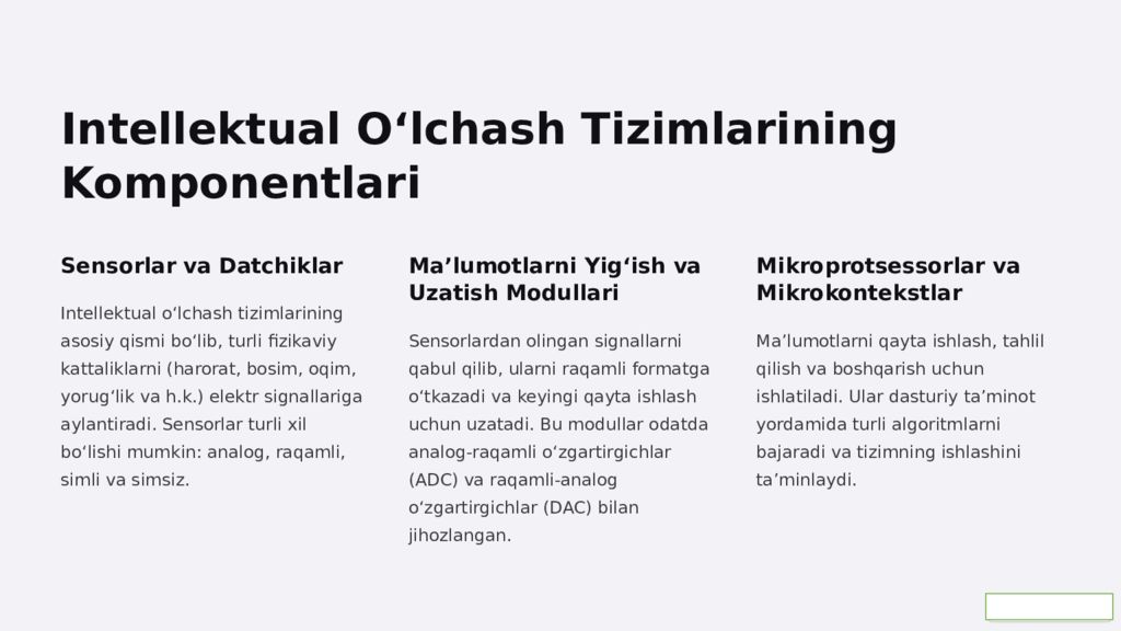 INTELLEKTUAL O‘LCHASH TIZIMLARI Intellektual o‘lchash tizimlari - bu zamonaviy texnologiyalarning muhim yo‘nalishi. Ular an’anaviy o‘lchash usullaridan farqli ravishda, ma’lumotlarni avtomatik ravishda yig‘ish, tahlil qilish va qayta ishlash imkonini beradi. Ushbu tizimlar sanoat, energetika, tibbiyot va atrof-muhit monitoringi kabi sohalarda keng qo‘llanilmoqda. Ushbu taqdimotda biz intellektual o‘lchash tizimlarining mohiyati, komponentlari, qo‘llanilishi va kelajak istiqbollarini ko‘rib chiqamiz. Shuningdek, intellektual tizimlar uchun maxsus dasturlarning roli va ahamiyatiga alohida e’tibor qaratamiz. IO