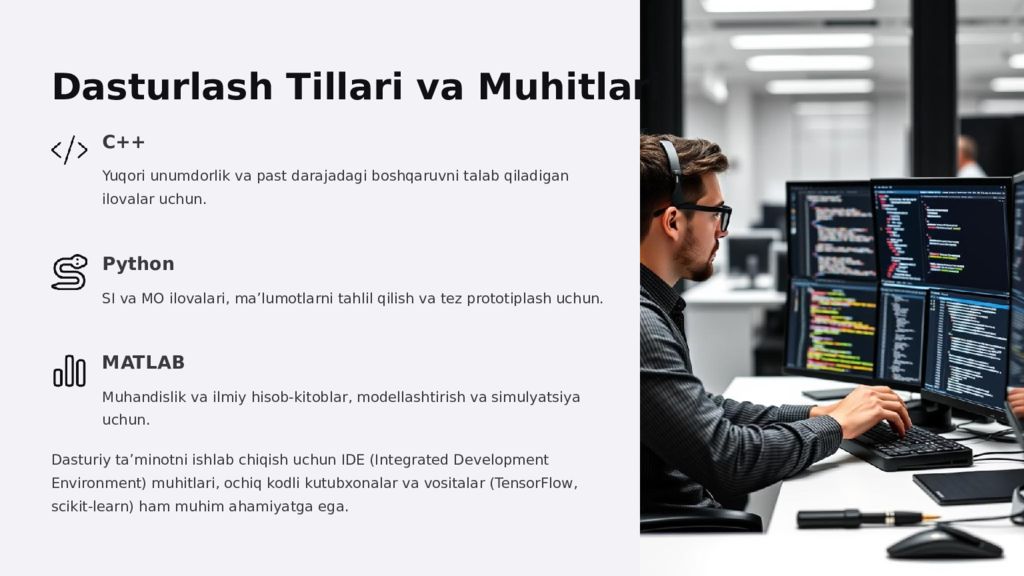 Dasturlash Tillari va Muhitlari C++ Yuqori unumdorlik va past darajadagi boshqaruvni talab qiladigan ilovalar uchun. Python SI va MO ilovalari, ma’lumotlarni tahlil qilish va tez prototiplash uchun. MATLAB Muhandislik va ilmiy hisob-kitoblar, modellashtirish va simulyatsiya uchun. Dasturiy ta’minotni ishlab chiqish uchun IDE (Integrated Development Environment) muhitlari, ochiq kodli kutubxonalar va vositalar (TensorFlow, scikit-learn) ham muhim ahamiyatga ega.