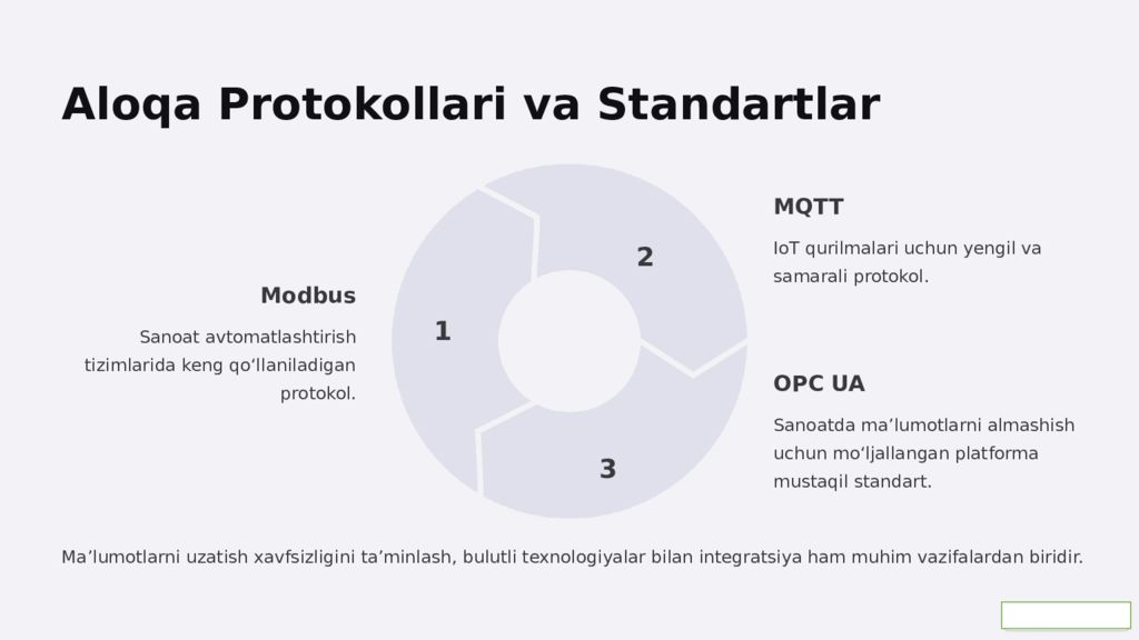 Aloqa Protokollari va Standartlar Modbus Sanoat avtomatlashtirish tizimlarida keng qo‘llaniladigan protokol. 1 MQTT IoT qurilmalari uchun yengil va samarali protokol. 2 OPC UA Sanoatda ma’lumotlarni almashish uchun mo‘ljallangan platforma mustaqil standart. 3 Ma’lumotlarni uzatish xavfsizligini ta’minlash, bulutli texnologiyalar bilan integratsiya ham muhim vazifalardan biridir.