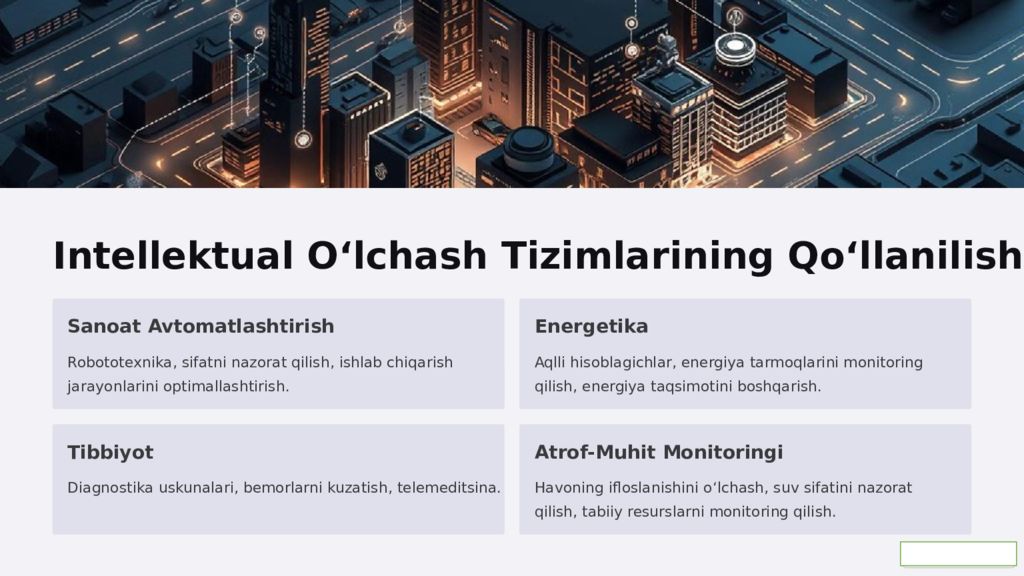 Intellektual O‘lchash Tizimlarining Qo‘llanilishi Sanoat Avtomatlashtirish Robototexnika, sifatni nazorat qilish, ishlab chiqarish jarayonlarini optimallashtirish. Energetika Aqlli hisoblagichlar, energiya tarmoqlarini monitoring qilish, energiya taqsimotini boshqarish. Tibbiyot Diagnostika uskunalari, bemorlarni kuzatish, telemeditsina. Atrof-Muhit Monitoringi Havoning ifloslanishini o‘lchash, suv sifatini nazorat qilish, tabiiy resurslarni monitoring qilish.