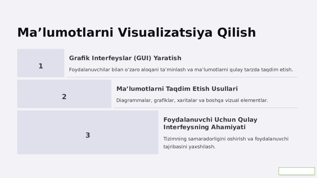 Ma’lumotlarni Visualizatsiya Qilish 1 Grafik Interfeyslar (GUI) Yaratish Foydalanuvchilar bilan o‘zaro aloqani ta’minlash va ma’lumotlarni qulay tarzda taqdim etish. 2 Ma’lumotlarni Taqdim Etish Usullari Diagrammalar, grafiklar, xaritalar va boshqa vizual elementlar. 3 Foydalanuvchi Uchun Qulay Interfeysning Ahamiyati Tizimning samaradorligini oshirish va foydalanuvchi tajribasini yaxshilash.