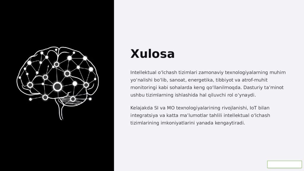 Xulosa Intellektual o‘lchash tizimlari zamonaviy texnologiyalarning muhim yo‘nalishi bo‘lib, sanoat, energetika, tibbiyot va atrof-muhit monitoringi kabi sohalarda keng qo‘llanilmoqda. Dasturiy ta’minot ushbu tizimlarning ishlashida hal qiluvchi rol o‘ynaydi. Kelajakda SI va MO texnologiyalarining rivojlanishi, IoT bilan integratsiya va katta ma’lumotlar tahlili intellektual o‘lchash tizimlarining imkoniyatlarini yanada kengaytiradi.
