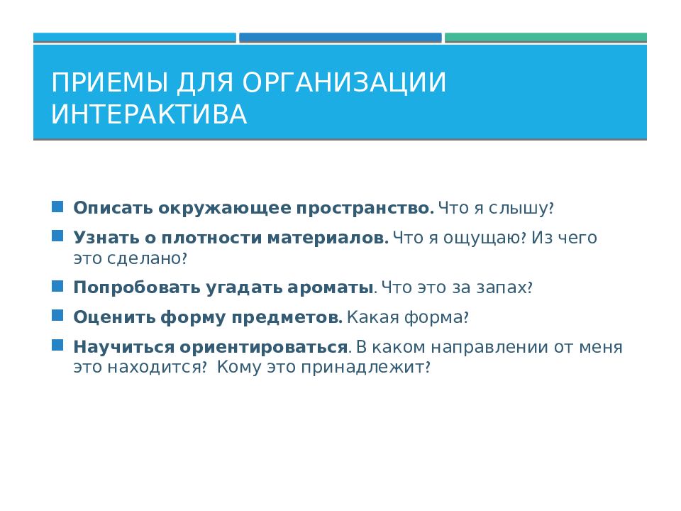 Описать окружающее пространство. Что я слышу? Узнать о плотности материалов. Что я ощущаю? Из чего это сделано? Попробовать угадать ароматы. Что это за запах? Оценить форму предметов. Какая форма? Научиться ориентироваться. В каком направлении от меня это находится? Кому это принадлежит?