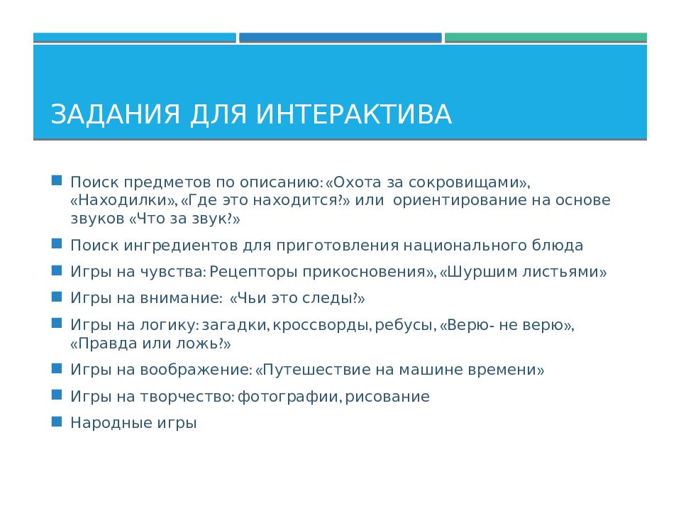 Поиск предметов по описанию: «Охота за сокровищами», « Находилки », «Где это находится?» или ориентирование на основе звуков «Что за звук?» Поиск ингредиентов для приготовления национального блюда Игры на чувства: Рецепторы прикосновения», «Шуршим листьями» Игры на внимание: «Чьи это следы?» Игры на логику: загадки, кроссворды, ребусы, «Верю- не верю», «Правда или ложь?» Игры на воображение: «Путешествие на машине времени» Игры на творчество: фотографии, рисование Народные игры
