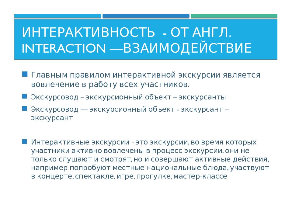 Главным правилом интерактивной экскурсии является вовлечение в работу всех участников. Экскурсовод – экскурсионный объект – экскурсанты Экскурсовод –– экскурсионный объект - экскурсант – экскурсант Интерактивные экскурсии - это экскурсии, во время которых участники активно вовлечены в процесс экскурсии, они не только слушают и смотрят, но и совершают активные действия, например попробуют местные национальные блюда, участвуют в концерте, спектакле, игре, прогулке, мастер-классе
