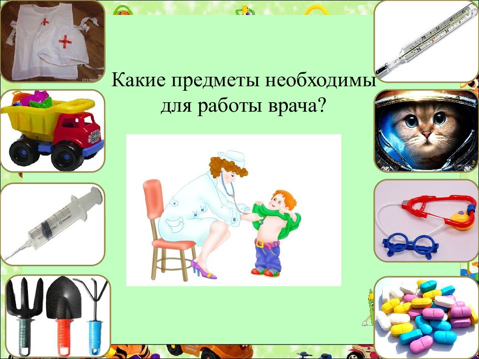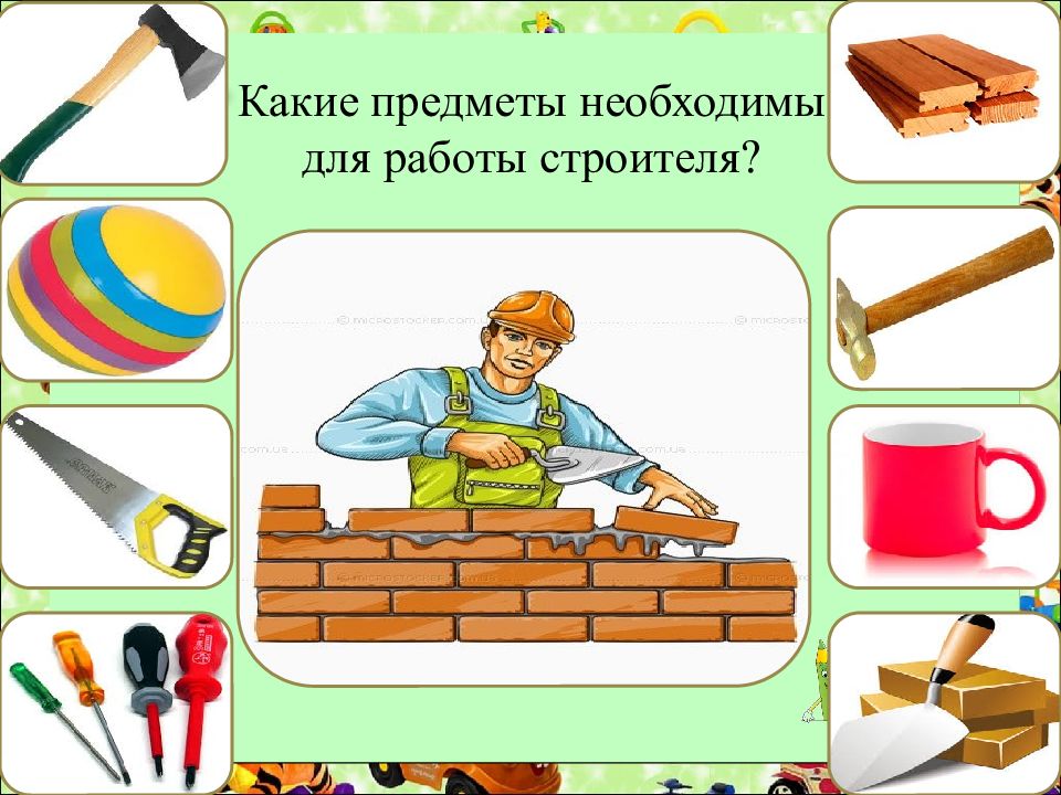 Здравствуйте, мои дорогие друзья! Как вы уже догадались - это я ваш друг Лунтик. Помогите м не у знать, кто же эти люди и какие предметы им нужны для работы?