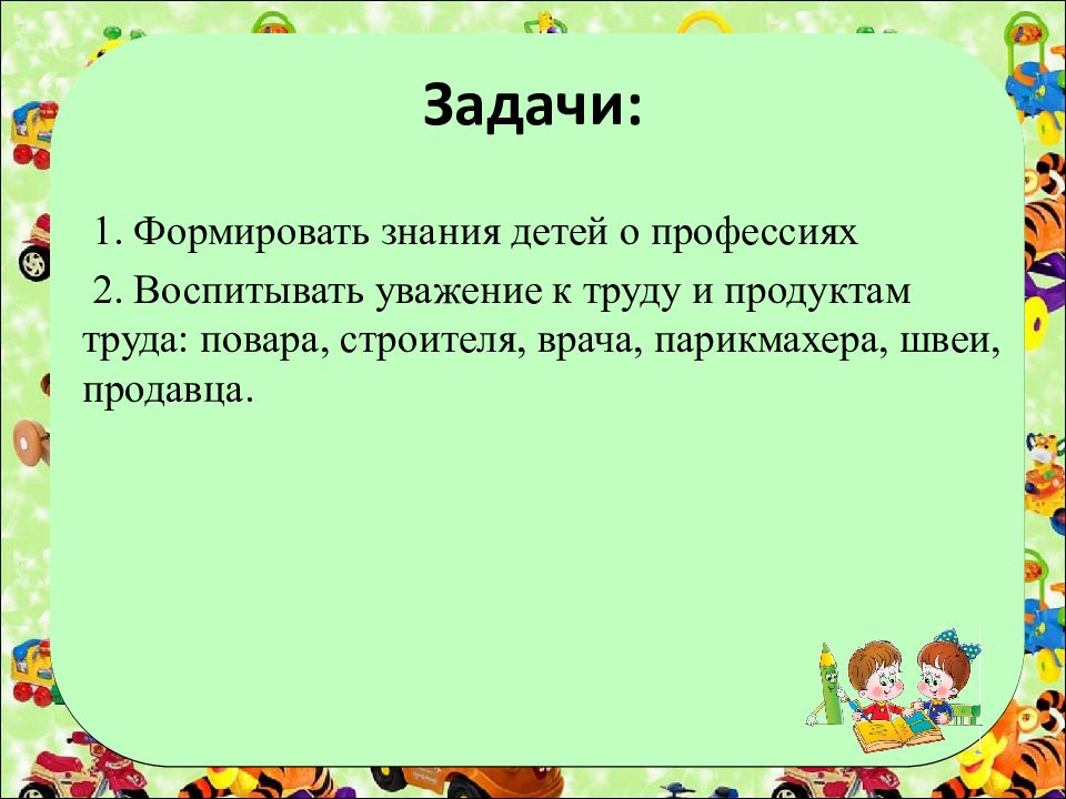1. Формировать знания детей о профессиях 2. Воспитывать уважение к труду и продуктам труда: повара, строителя, врача, парикмахера, швеи, продавца.