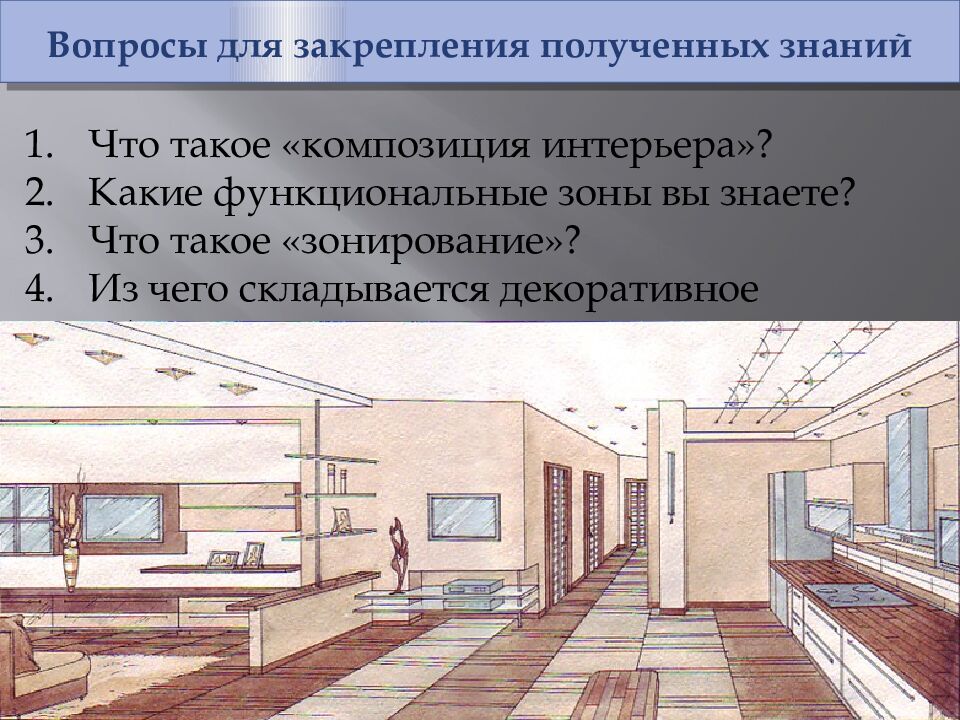 Вопросы для закрепления полученных знаний Что такое «композиция интерьера»? Какие функциональные зоны вы знаете? Что такое «зонирование»? Из чего складывается декоративное убранство?