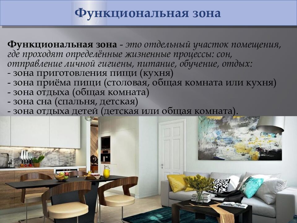 Функциональная зона Функциональная зона - это отдельный участок помещения, где проходят определённые жизненные процессы: сон, отправление личной гигиены, питание, обучение, отдых: - зона приготовления пищи (кухня) - зона приёма пищи (столовая, общая комната или кухня) - зона отдыха (общая комната) - зона сна (спальня, детская) - зона отдыха детей (детская или общая комната).