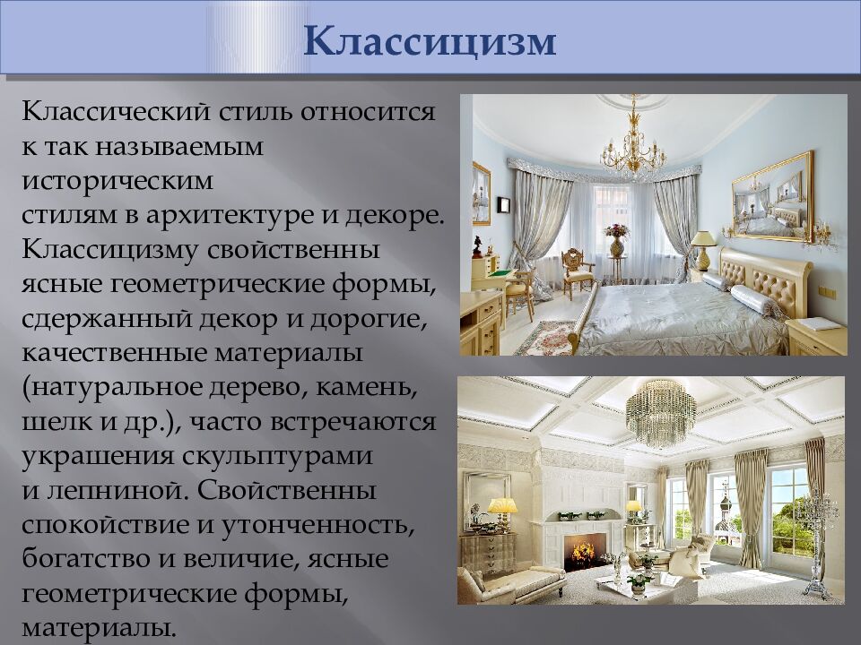 Классицизм Классический стиль относится к так называемым историческим стилям в архитектуре и декоре. Классицизму свойственны ясные геометрические формы, сдержанный декор и дорогие, качественные материалы (натуральное дерево, камень, шелк и др.), часто встречаются украшения скульптурами и лепниной. Свойственны спокойствие и утонченность, богатство и величие, ясные геометрические формы, материалы.