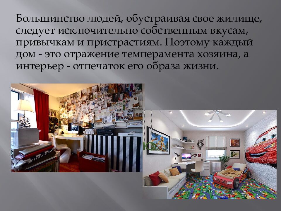 Большинство людей, обустраивая свое жилище, следует исключительно собственным вкусам, привычкам и пристрастиям. Поэтому каждый дом - это отражение темперамента хозяина, а интерьер - отпечаток его образа жизни.