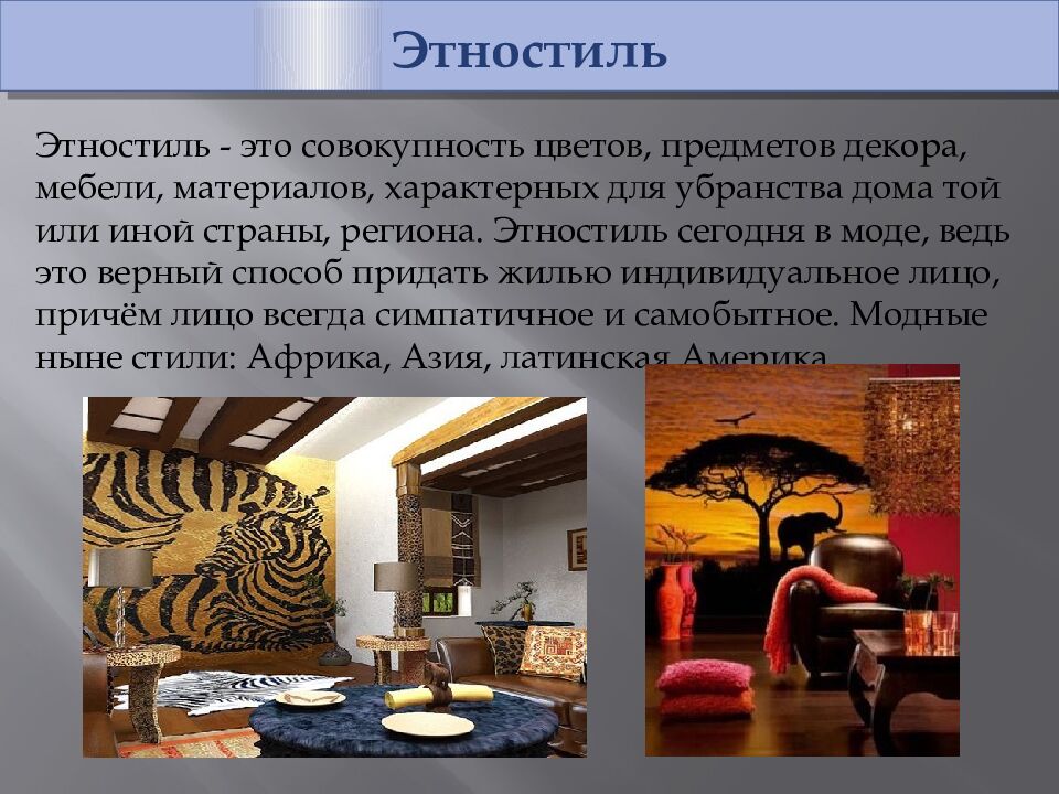 Этностиль Этностиль - это совокупность цветов, предметов декора, мебели, материалов, характерных для убранства дома той или иной страны, региона. Этностиль сегодня в моде, ведь это верный способ придать жилью индивидуальное лицо, причём лицо всегда симпатичное и самобытное. Модные ныне стили : Африка, Азия, латинская Америка.