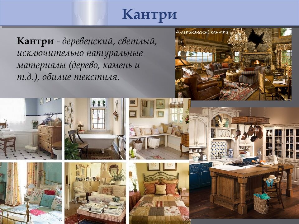 Кантри Кантри - деревенский, светлый, исключительно натуральные материалы (дерево, камень и т.д.), обилие текстиля.