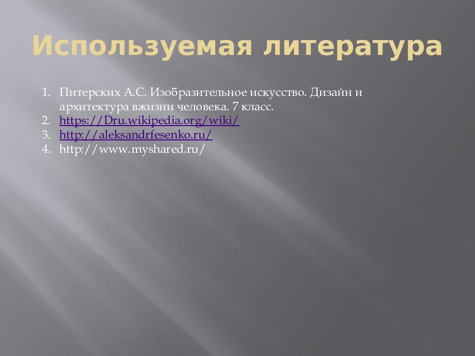 Питерских А.С. Изобразительное искусство. Дизайн и архитектура вжизни человека. 7 класс. https://Dru.wikipedia.org/wiki/ http://aleksandrfesenko.ru/ http://www.myshared.ru/