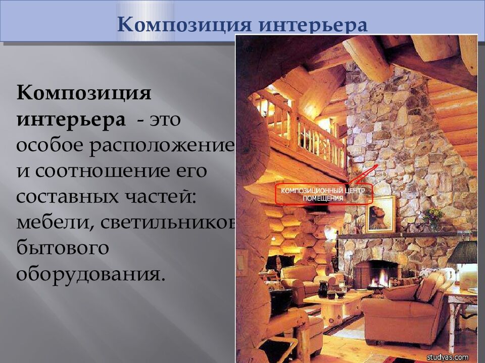 Композиция интерьера Композиция интерьера - это особое расположение и соотношение его составных частей: мебели, светильников, бытового оборудования.