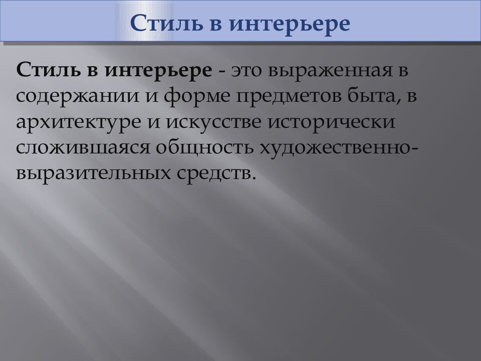 Стиль в интерьере Стиль в интерьере - это выраженная в содержании и форме предметов быта, в архитектуре и искусстве исторически сложившаяся общность художественно-выразительных средств.