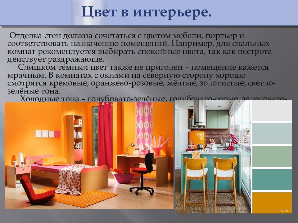 Цвет в интерьере. Отделка стен должна сочетаться с цветом мебели, портьер и соответствовать назначению помещений. Например, для спальных комнат рекомендуется выбирать спокойные цвета, так как пестрота действует раздражающе. Слишком тёмный цвет также не пригоден – помещение кажется мрачным. В комнатах с окнами на северную сторону хорошо смотрятся кремовые, оранжево-розовые, жёлтые, золотистые, светло-зелёные тона. Холодные тона – голубовато-зелёные, голубовато-серые, зеленовато-серые – хороши для комнат, окна которых выходят на юг.