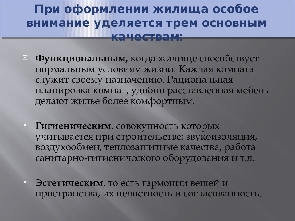 Москва При оформлении жилища особое внимание уделяется трем основным качествам: Функциональным, когда жилище способствует нормальным условиям жизни. Каждая комната служит своему назначению. Рациональная планировка комнат, удобно расставленная мебель делают жилье более комфортным. Гигиеническим, совокупность которых учитывается при строительстве: звукоизоляция, воздухообмен, теплозащитные качества, работа санитарно-гигиенического оборудования и т.д. Эстетическим, то есть гармонии вещей и пространства, их целостность и согласованность.
