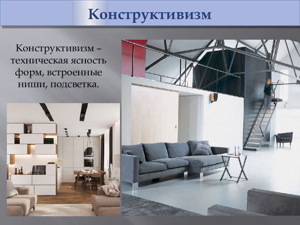 Конструктивизм Конструктивизм – техническая ясность форм, встроенные ниши, подсветка.