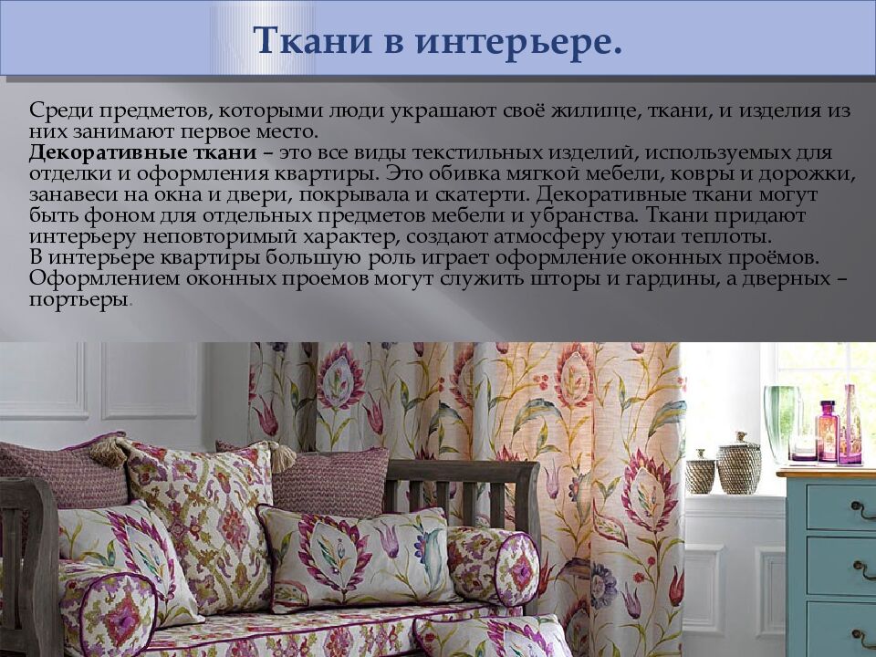 Ткани в интерьере. Среди предметов, которыми люди украшают своё жилище, ткани, и изделия из них занимают первое место. Декоративные ткани – это все виды текстильных изделий, используемых для отделки и оформления квартиры. Это обивка мягкой мебели, ковры и дорожки, занавеси на окна и двери, покрывала и скатерти. Декоративные ткани могут быть фоном для отдельных предметов мебели и убранства. Ткани придают интерьеру неповторимый характер, создают атмосферу уютаи теплоты. В интерьере квартиры большую роль играет оформление оконных проёмов. Оформлением оконных проемов могут служить шторы и гардины, а дверных – портьеры.