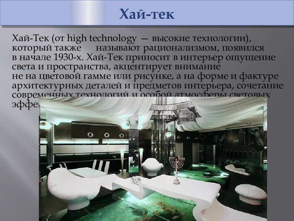 Хай-тек Хай-Тек (от high technology — высокие технологии), который также называют рационализмом, появился в начале 1930-х. Хай-Тек приносит в интерьер ощущение света и пространства, акцентирует внимание не на цветовой гамме или рисунке, а на форме и фактуре архитектурных деталей и предметов интерьера, сочетание современных технологий и особой атмосферы световых эффектов.