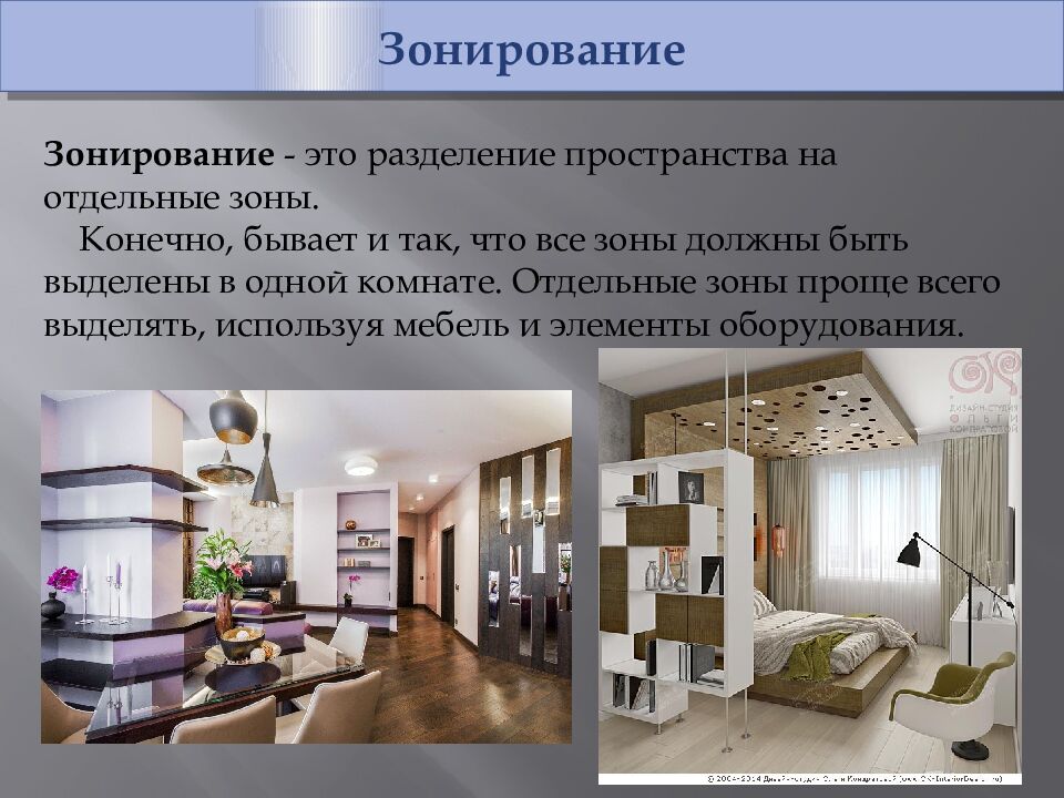 Зонирование Зонирование - это разделение пространства на отдельные зоны. Конечно, бывает и так, что все зоны должны быть выделены в одной комнате. Отдельные зоны проще всего выделять, используя мебель и элементы оборудования.