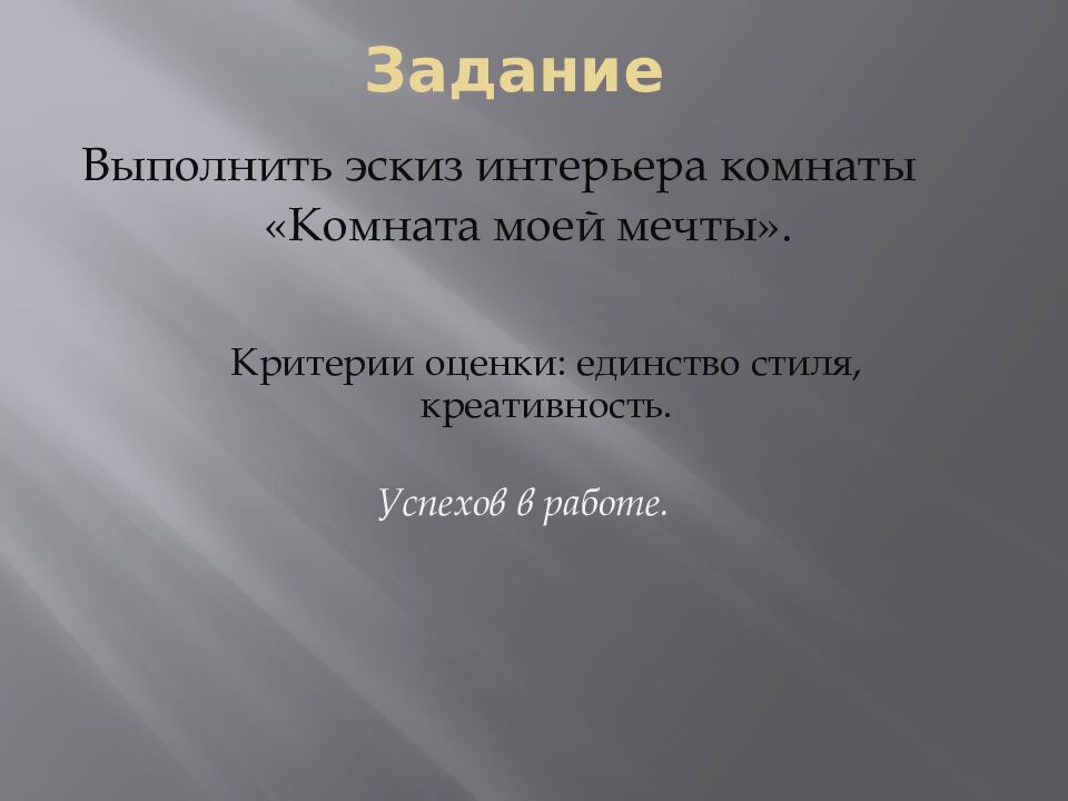 Выполнить эскиз интерьера комнаты «Комната моей мечты». Критерии оценки: единство стиля, креативность. Успехов в работе.