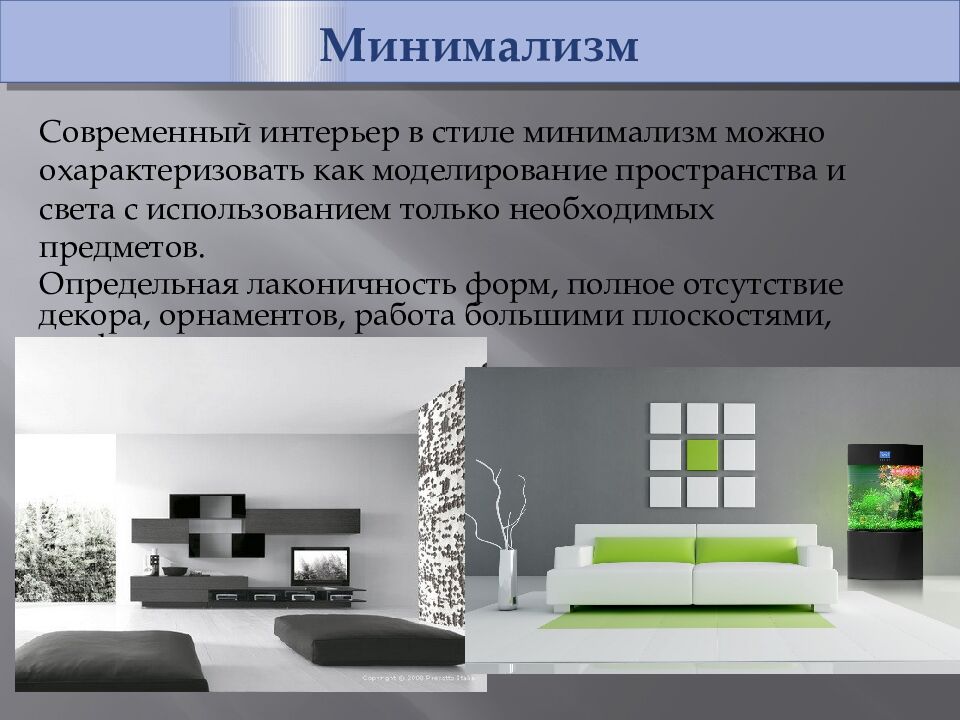 Минимализм Современный интерьер в стиле минимализм можно охарактеризовать как моделирование пространства и света с использованием только необходимых предметов. Определьная лаконичность форм, полное отсутствие декора, орнаментов, работа большими плоскостями, графичность.