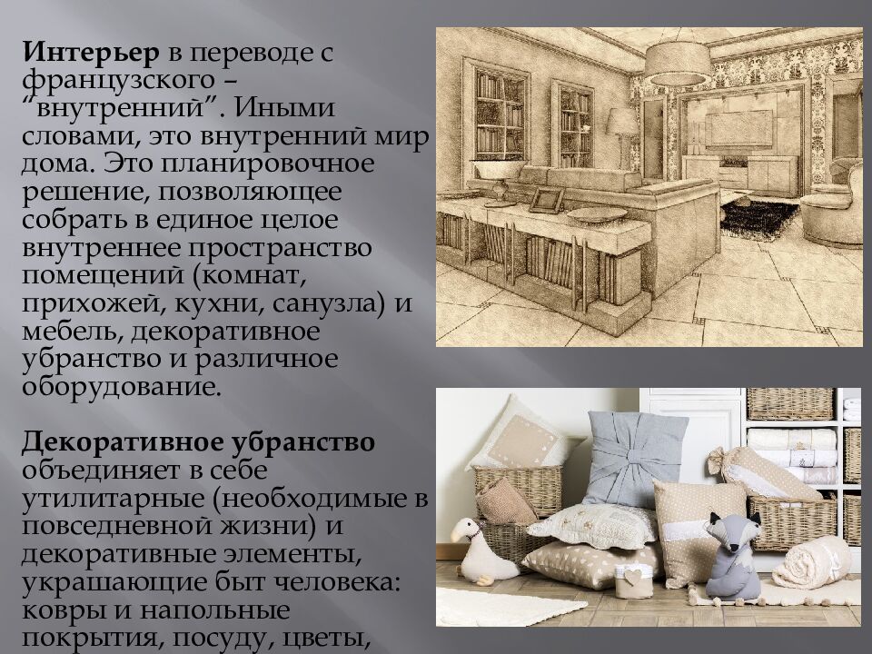 Интерьер в переводе с французского – “внутренний”. Иными словами, это внутренний мир дома. Это планировочное решение, позволяющее собрать в единое целое внутреннее пространство помещений (комнат, прихожей, кухни, санузла) и мебель, декоративное убранство и различное оборудование. Д екоративное убранство объединяет в себе утилитарные (необходимые в повседневной жизни) и декоративные элементы, украшающие быт человека: ковры и напольные покрытия, посуду, цветы, картины, музыкальное оформление.
