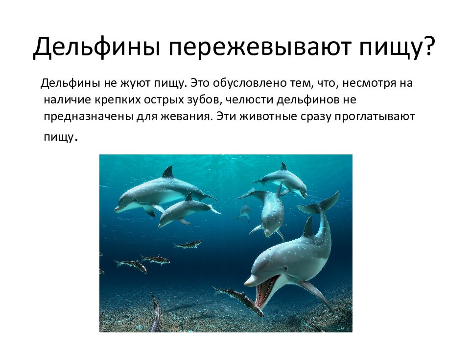 Дельфины не жуют пищу. Это обусловлено тем, что, несмотря на наличие крепких острых зубов, челюсти дельфинов не предназначены для жевания. Эти животные сразу проглатывают пищу.