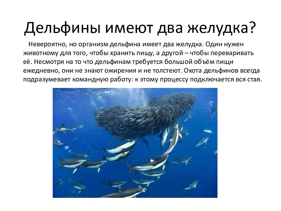 Невероятно, но организм дельфина имеет два желудка. Один нужен животному для того, чтобы хранить пищу, а другой – чтобы переваривать её. Несмотря на то что дельфинам требуется большой объём пищи ежедневно, они не знают ожирения и не толстеют. Охота дельфинов всегда подразумевает командную работу: к этому процессу подключается вся стая.