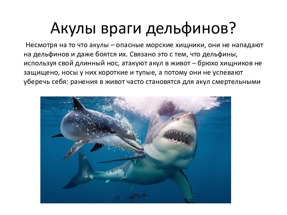 Несмотря на то что акулы – опасные морские хищники, они не нападают на дельфинов и даже боятся их. Связано это с тем, что дельфины, используя свой длинный нос, атакуют акул в живот – брюхо хищников не защищено, носы у них короткие и тупые, а потому они не успевают уберечь себя: ранения в живот часто становятся для акул смертельными