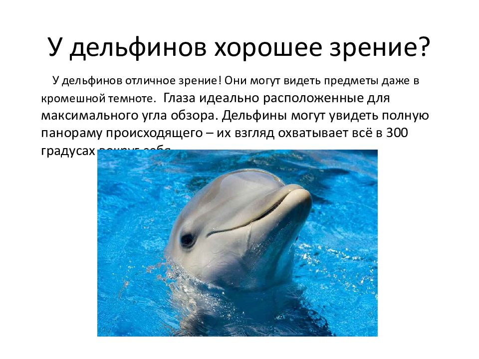 У дельфинов отличное зрение! Они могут видеть предметы даже в кромешной темноте. Глаза идеально расположенные для максимального угла обзора. Дельфины могут увидеть полную панораму происходящего – их взгляд охватывает всё в 300 градусах вокруг себя.